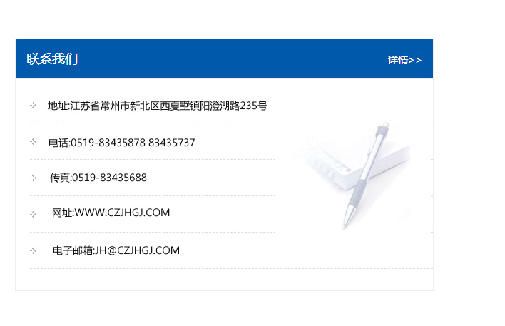 地址:常州市新北區友邦商務大廈1幢16、17層  電話:0519-85101652  傳真:0519-85112595  郵編:213022  網址:www.cz-jiayue_cn.cqwljj.com  郵箱:xiajifengaa@163.com